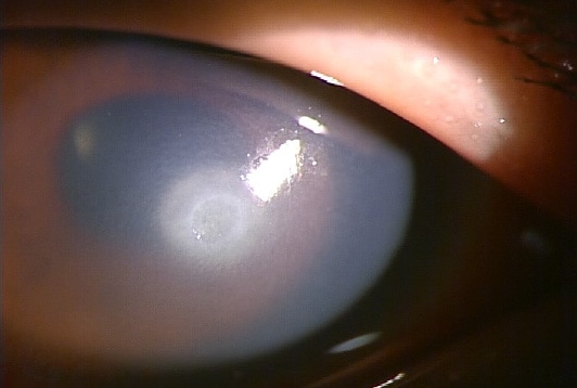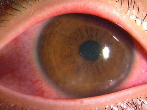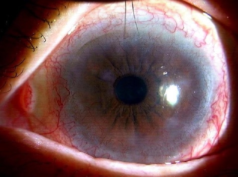 視力が低下し、眼の表面の角膜が混濁し、強い充血を伴います。