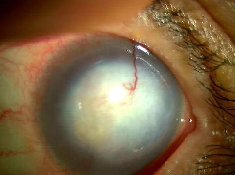 視力が低下し、眼の表面の角膜が混濁し、強い充血を伴います。