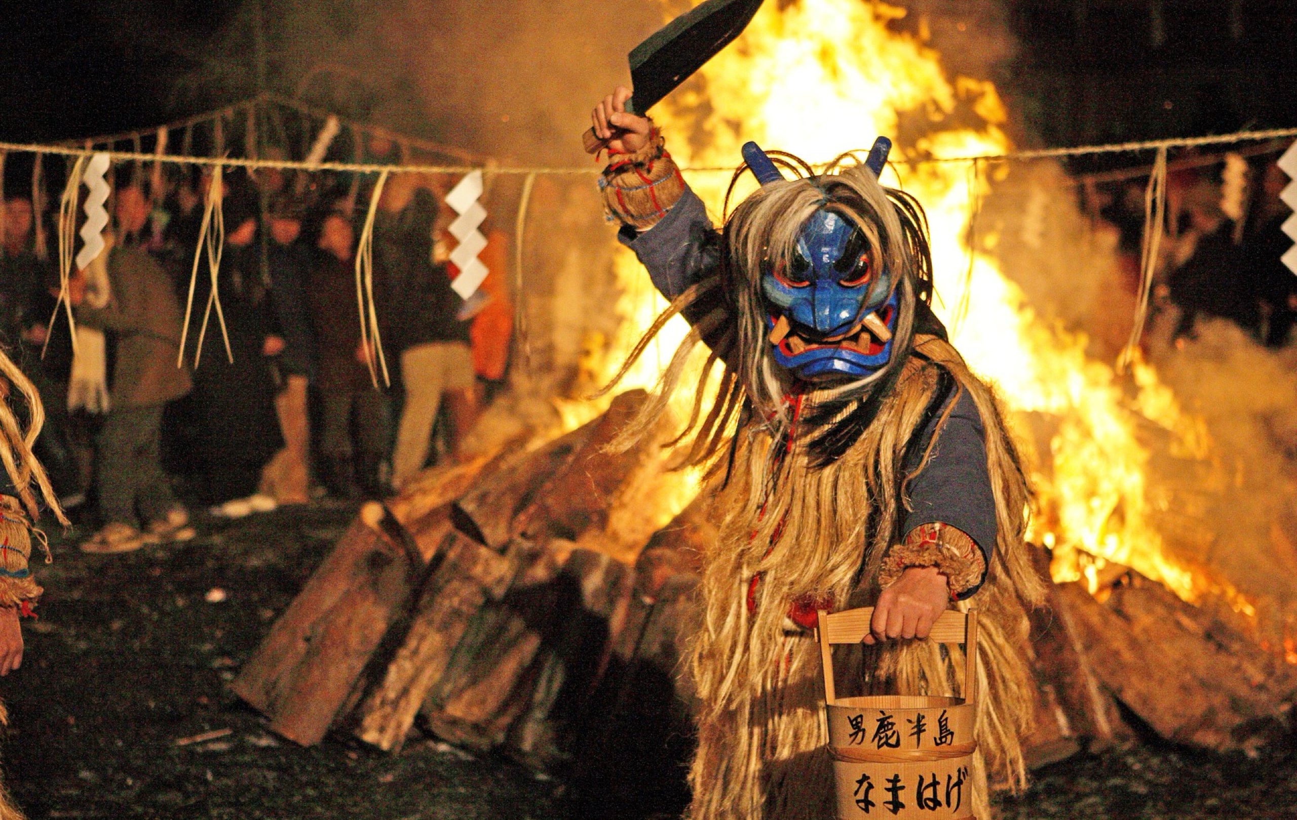 焚き上げられた柴灯火(さいとう)のもと勇壮ななまはげの舞が繰り広げられる「なまはげ柴灯(せど)まつり」。