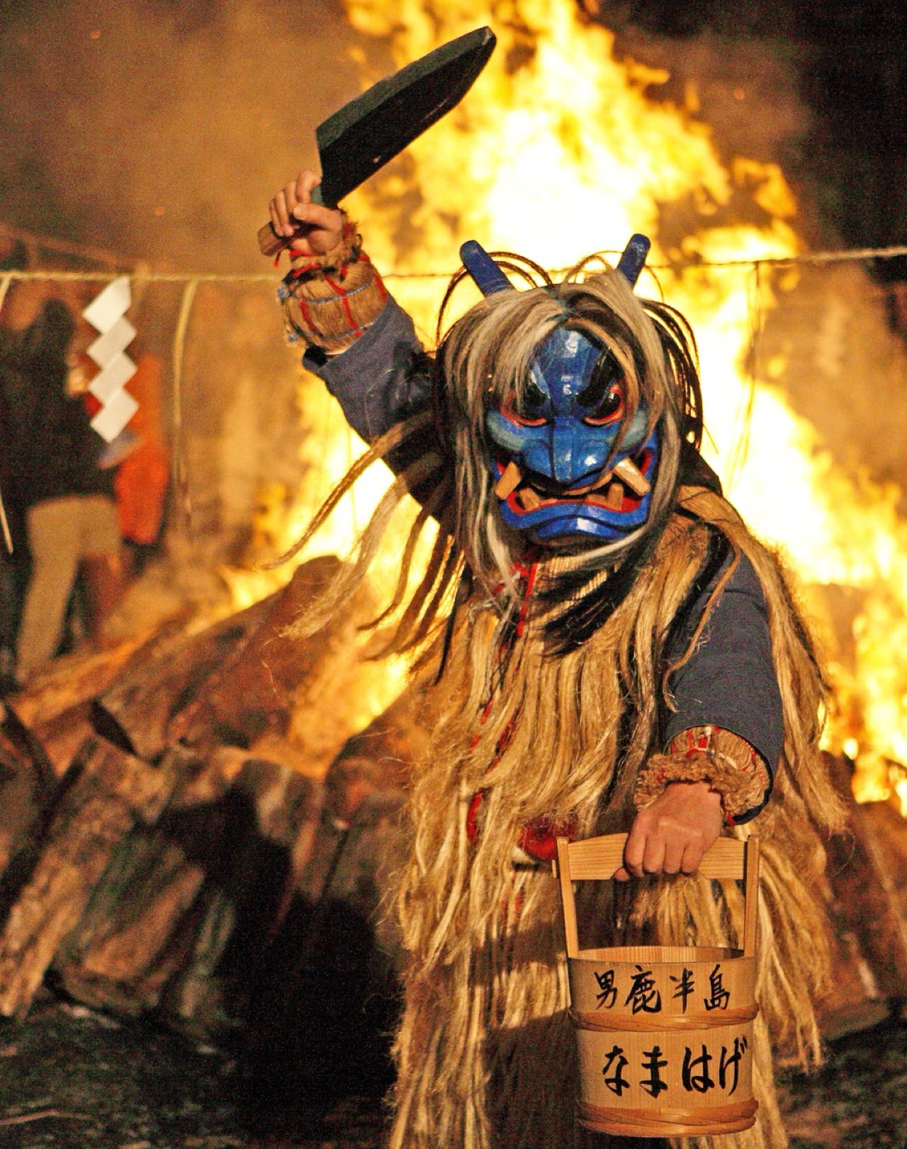 焚き上げられた柴灯火(さいとう)のもと勇壮ななまはげの舞が繰り広げられる「なまはげ柴灯(せど)まつり」。