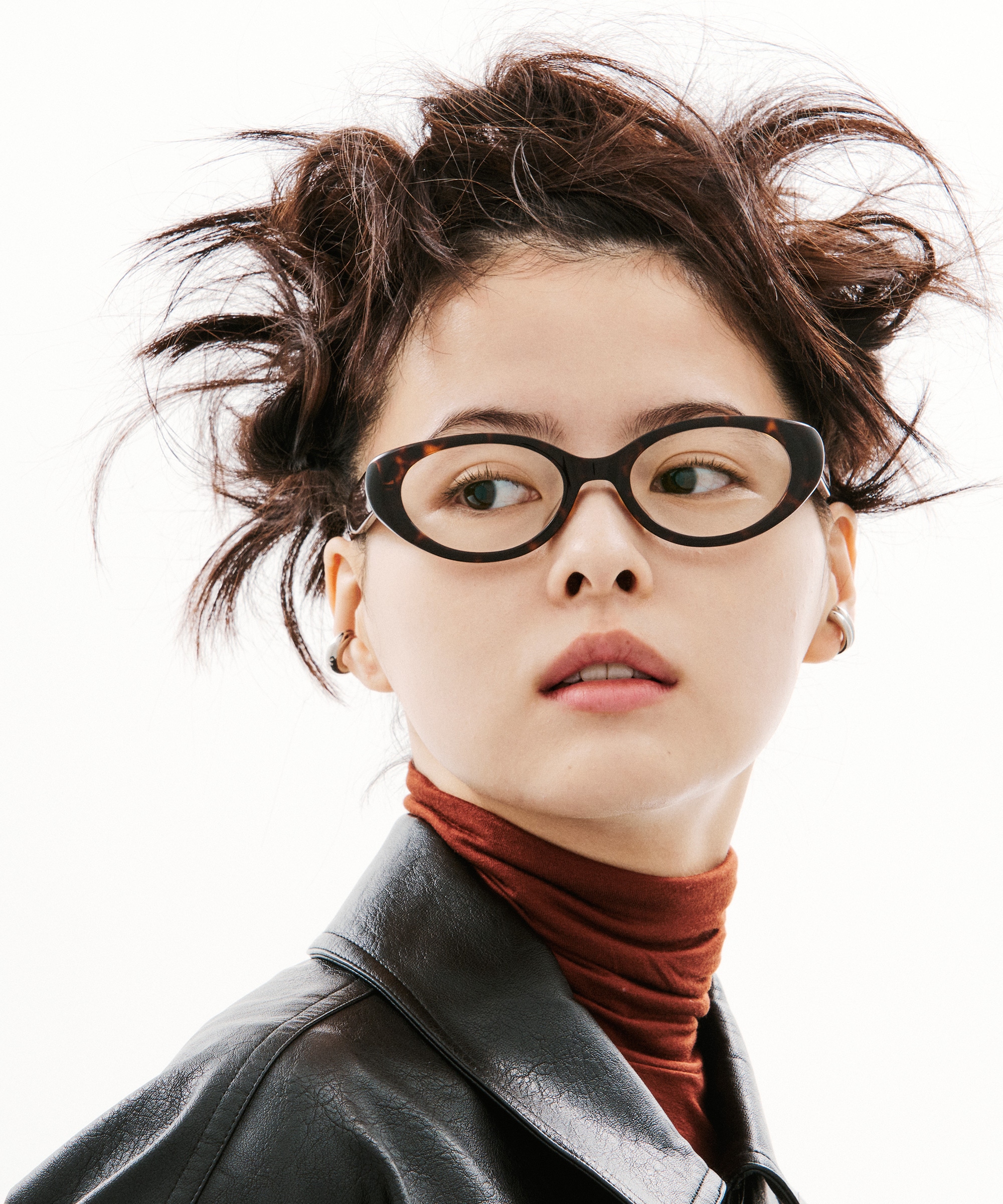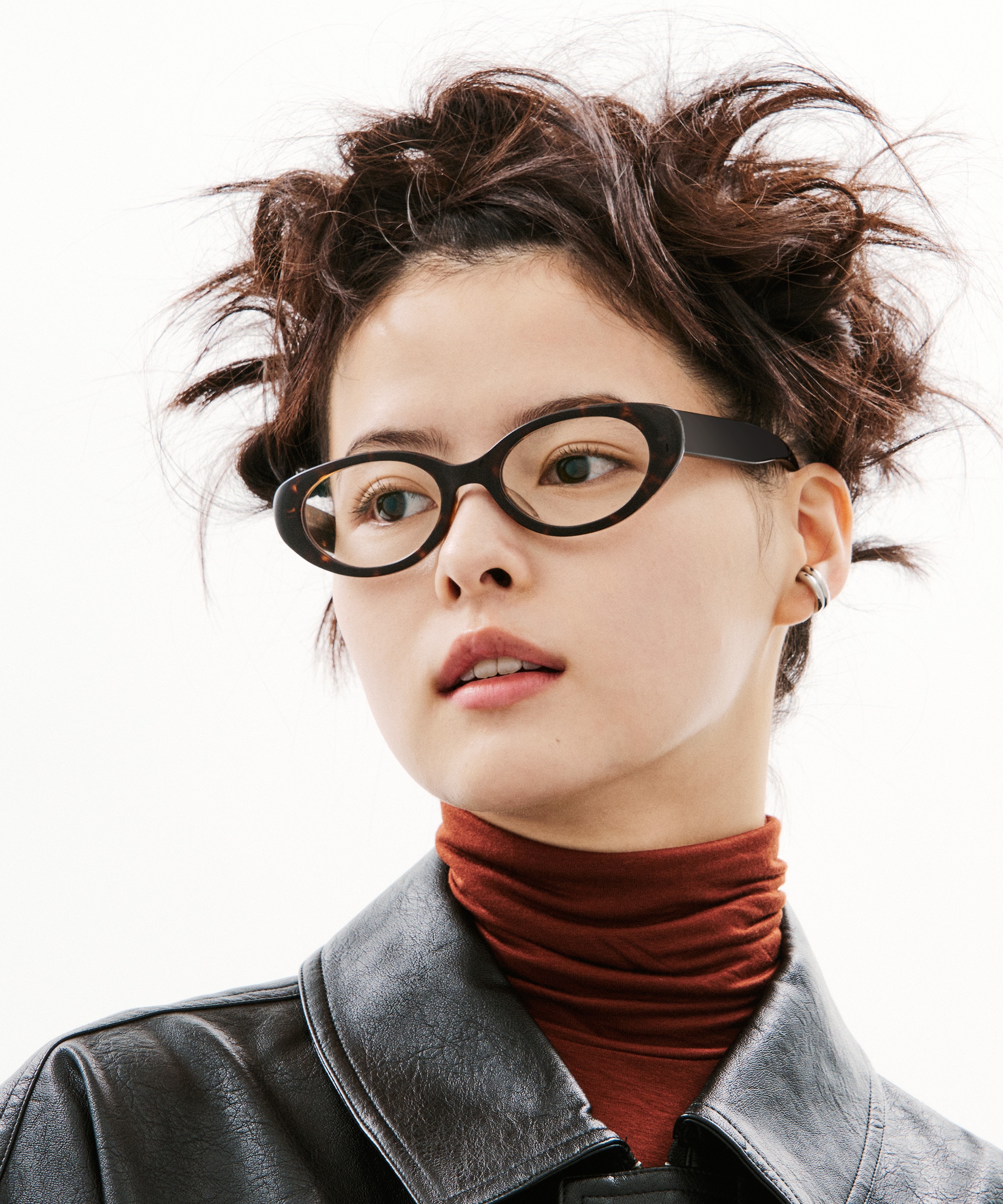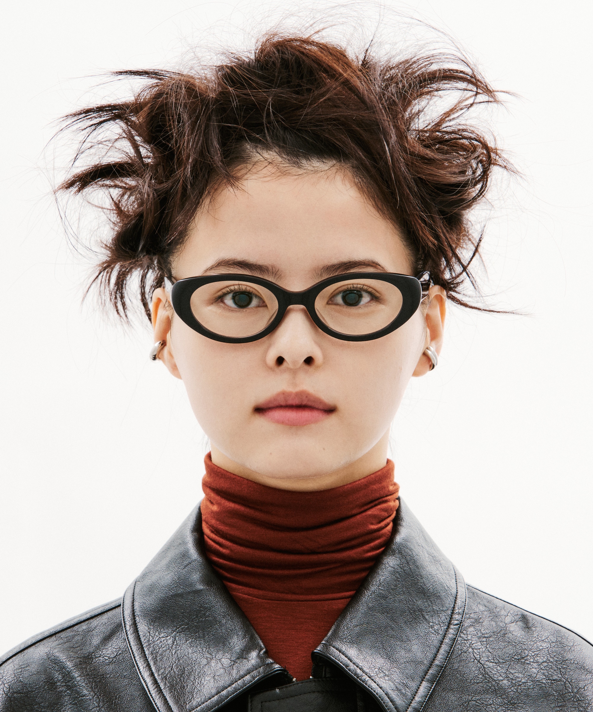 そのスタイルに合わせるメガネは、近未来的なサイバーチックなデザイン。