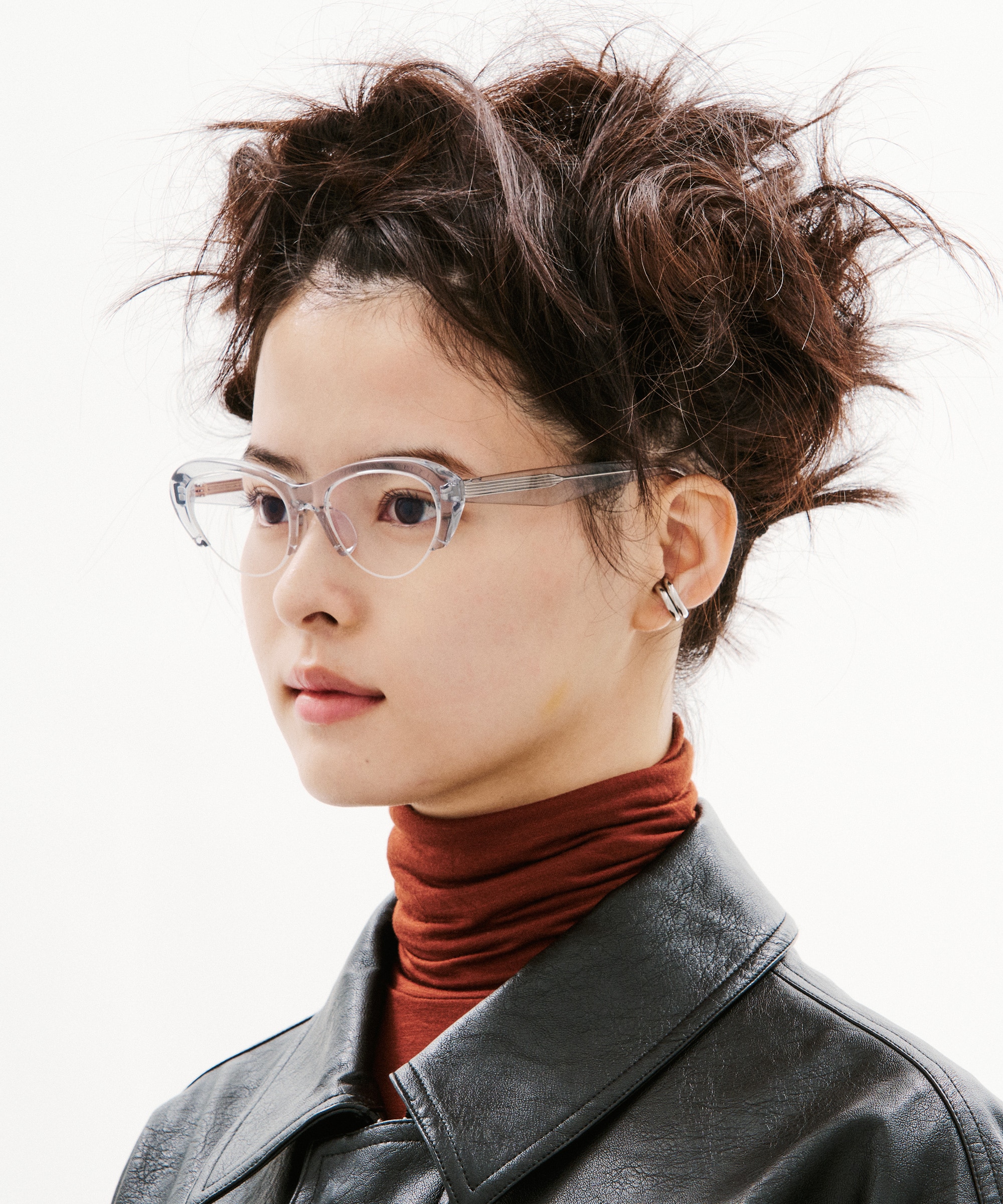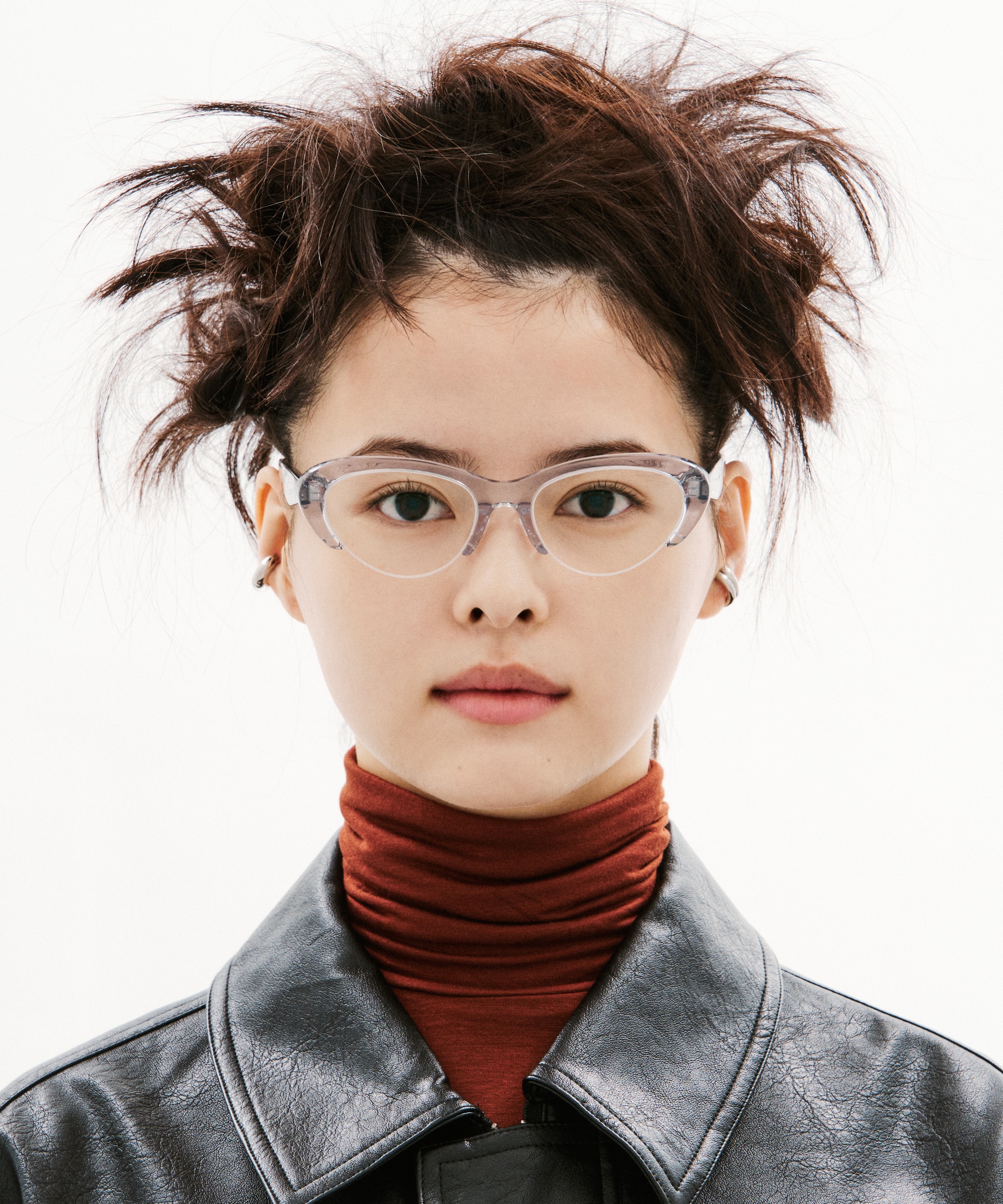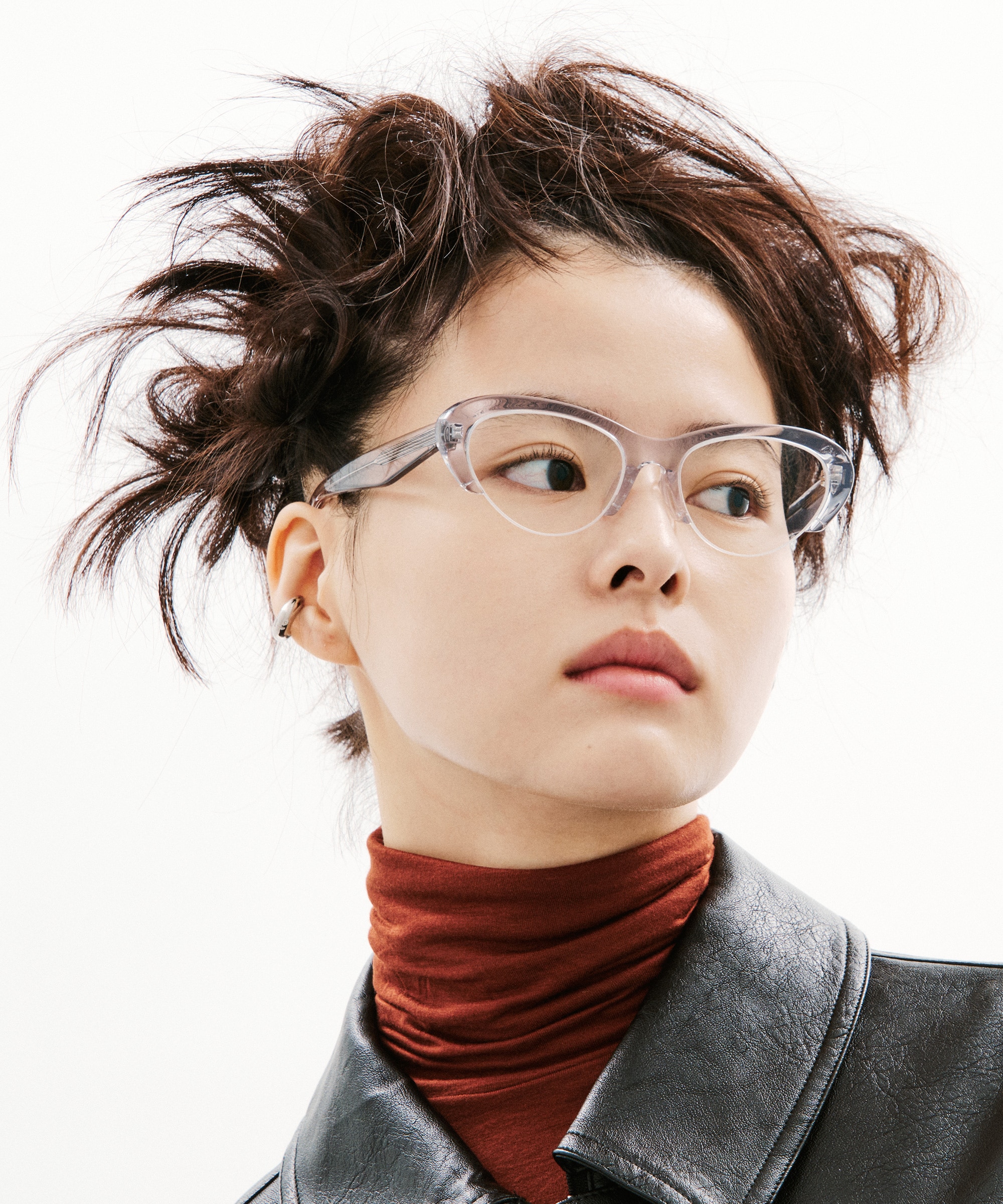 そのスタイルに合わせるメガネは、近未来的なサイバーチックなデザイン。