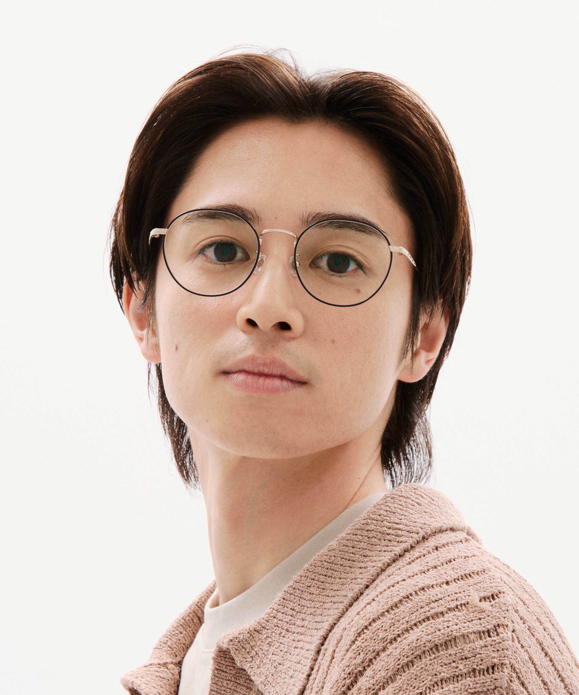 ミニマルな形状にテンプルの小さな彫金がアクセントとなり、洗練された印象を演出します。また、ボストン型の玉型は、僕のような面長な顔型にもフィットし、細身のテンプルが横顔のラインを印象的に引き立てます。テンプルのヴィンテージ調の彫金はアクセサリーとの相性も良く、トレンドを取り入れたシンプルながらお洒落なメガネフレームです。程よい存在感と機能性を兼ね備えた、おすすめのアイテムです。