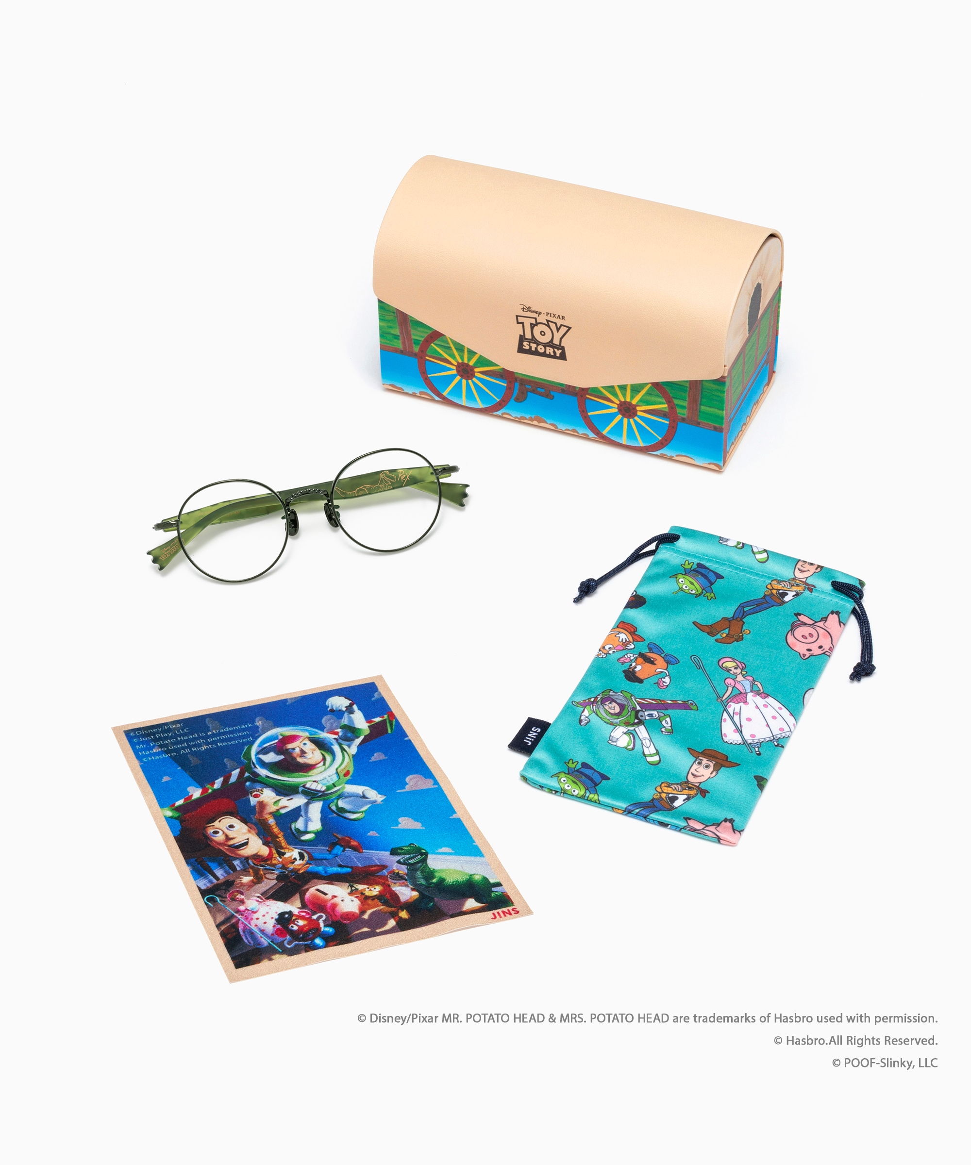 アンディのおもちゃ箱をイメージしたメガネケースや、ポスターアートのメガネ拭きが付属します。