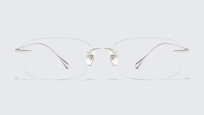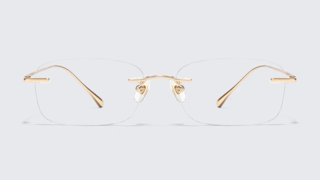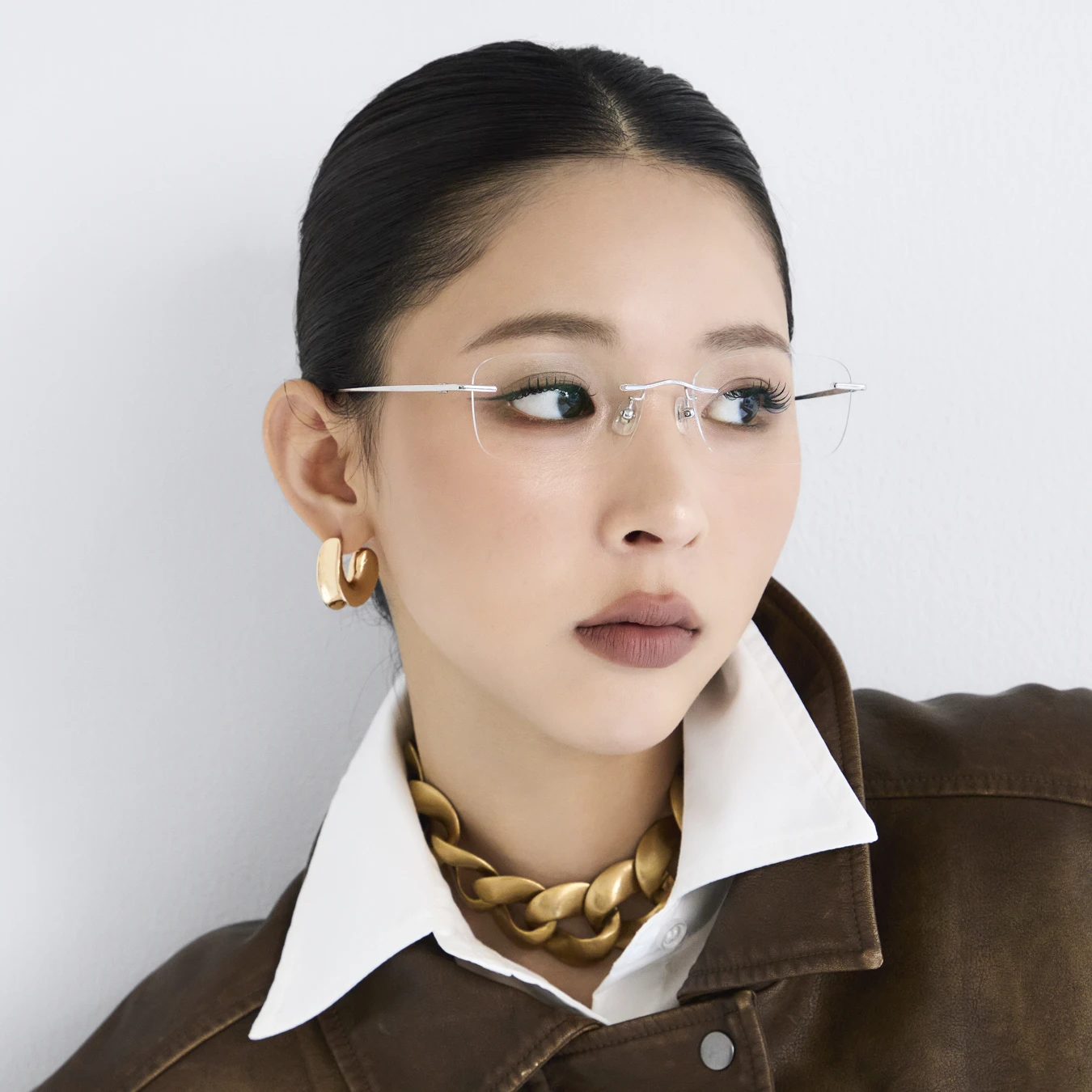Eyes defined with brown tones add depth and contour, giving the gaze behind rimless frames a sense of strength and confidence.