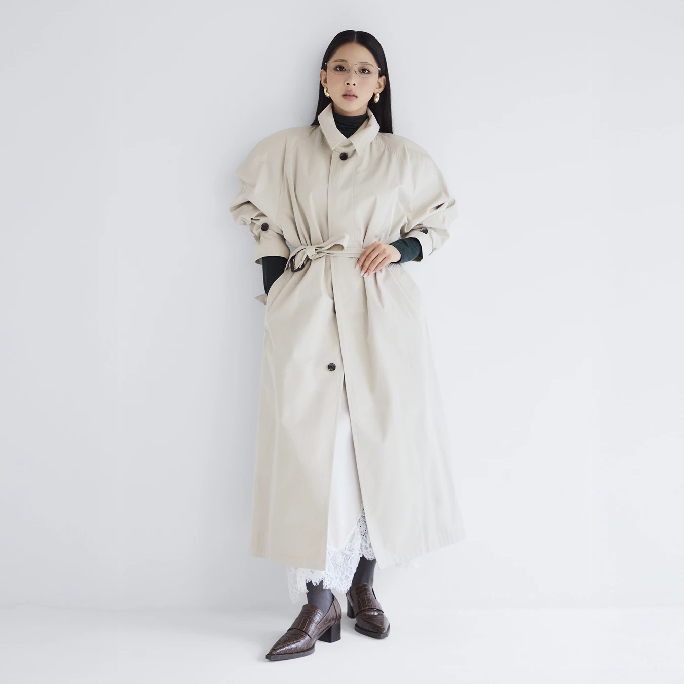 From a straight-lined, structured trench coat, let a hint of a delicate lace skirt peek through to instantly elevate the look and double the trend impact.