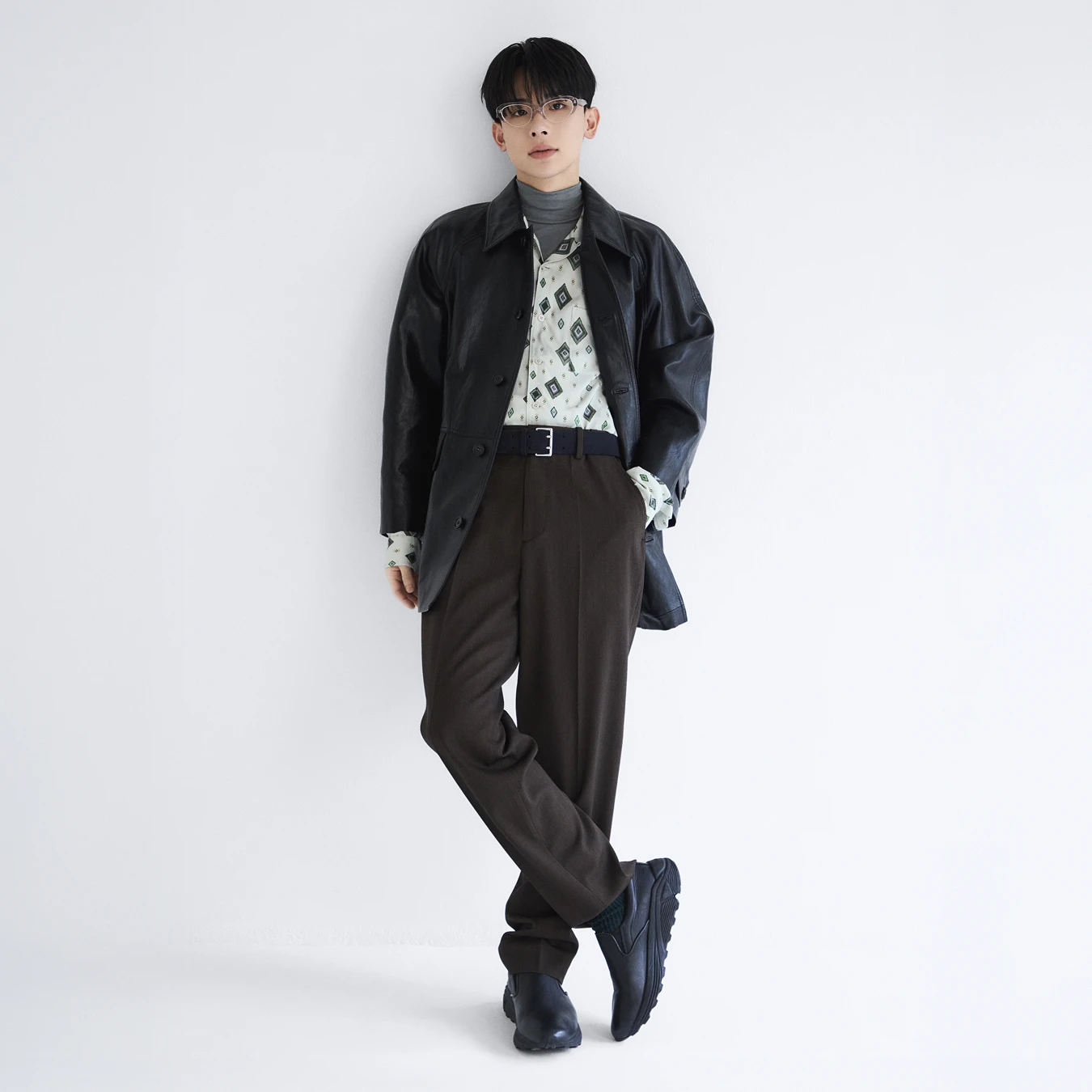 Introduce a bold printed shirt to give the outfit a smart yet playful twist, finished with semi-rimless cat-eye frames.
