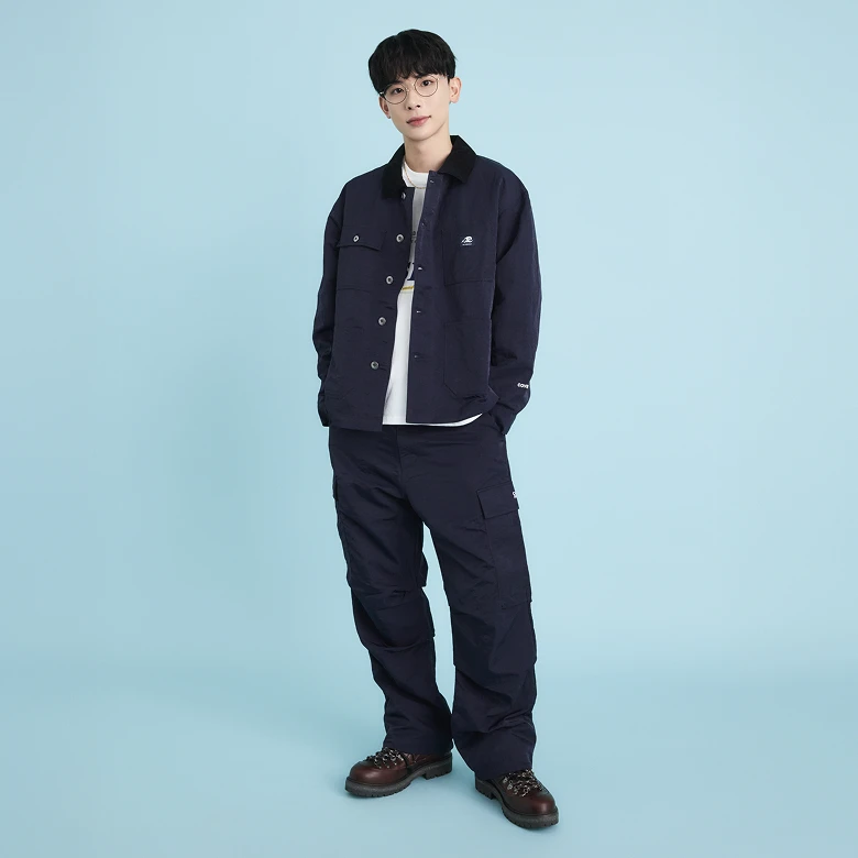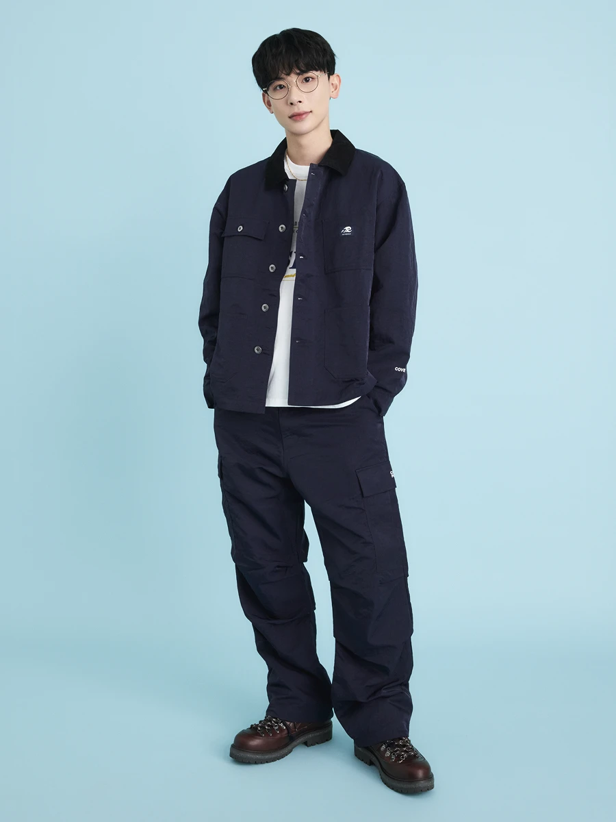 Known for its contrast collar, this look opts for a modern navy color in a similar tone, styled simply as a coordinated set.