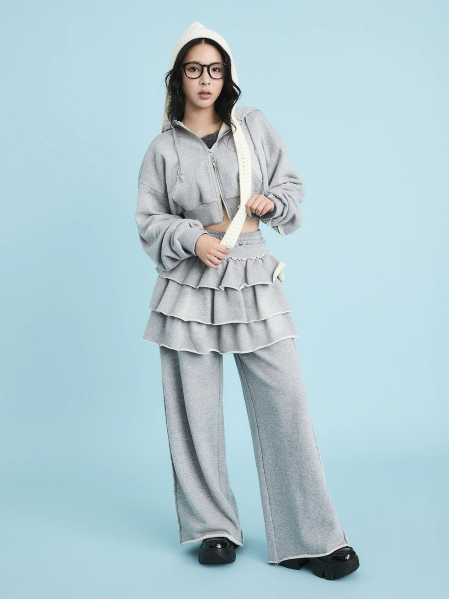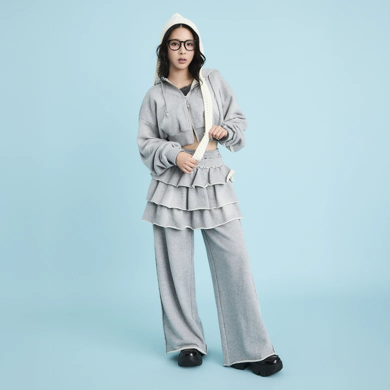 Even with classic gray sweatshirts, this outfit updates the standard with playful twists with a cropped hoodie layered over wide-leg pants and a tiered ruffle skirt.