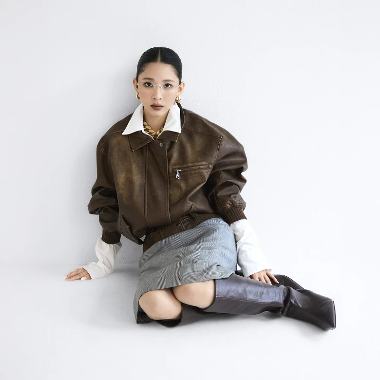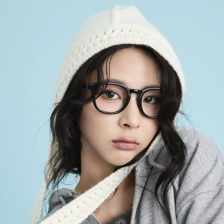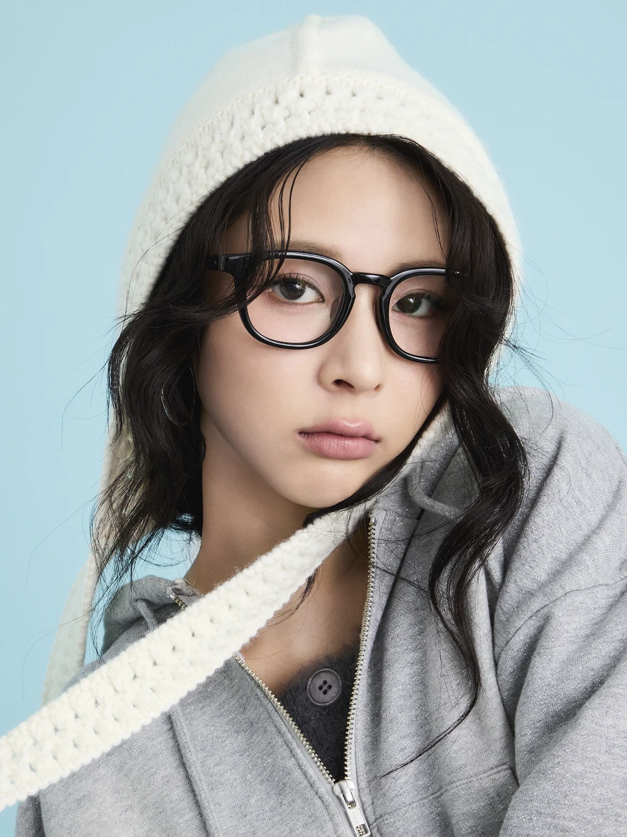 To contrast the strong presence of the glasses, the styling adds a sweet, soft touch, creating a balanced, eye-catching look.