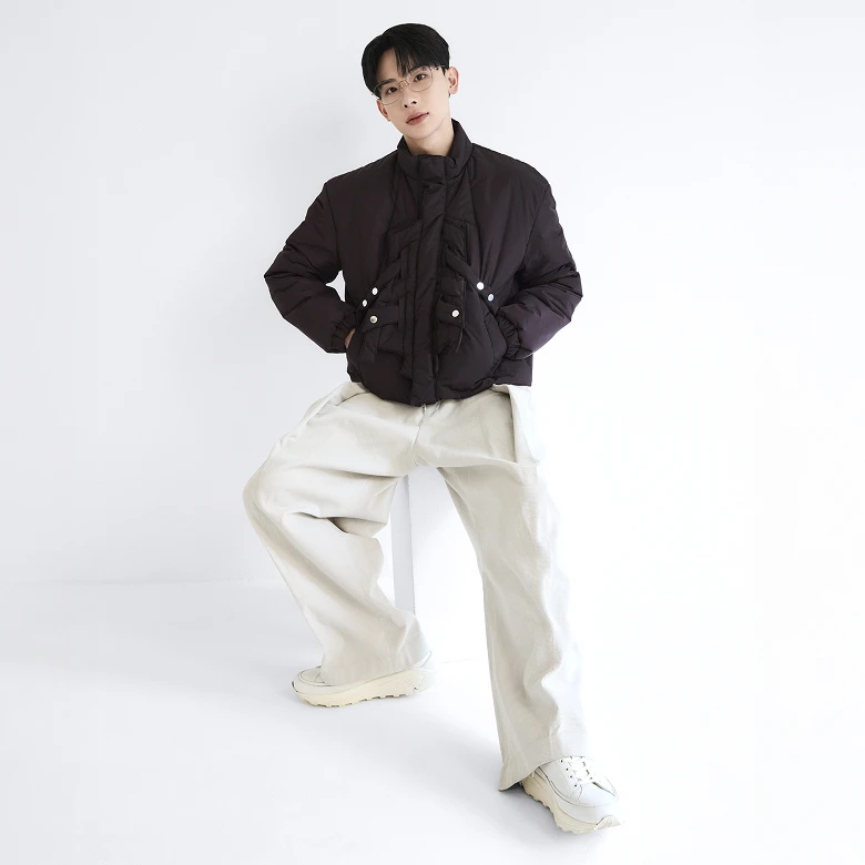 Even a puffer jacket, typically seen as casual, can feel modern when reworked with clean, linear silhouettes and belt details.