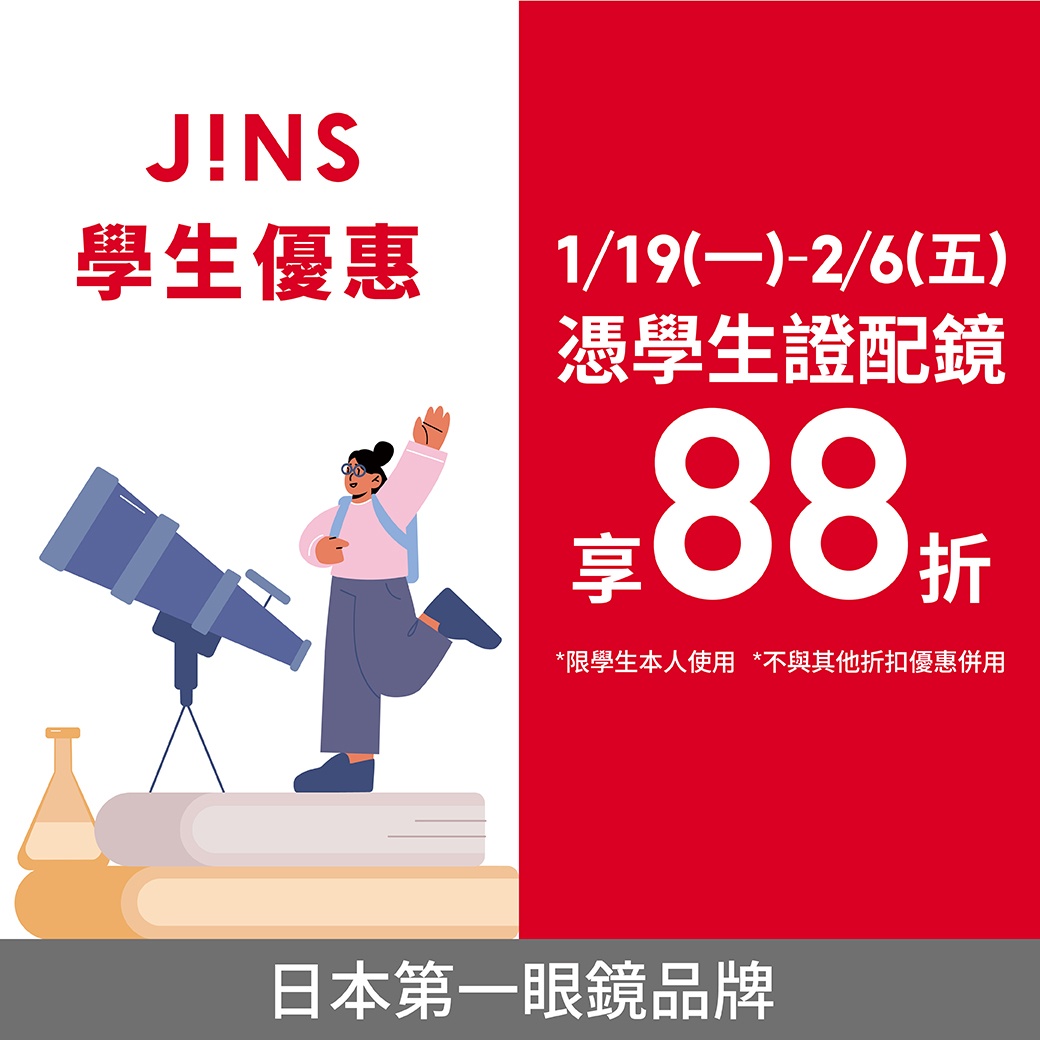 🎓 學生限定寒假優惠 1/19(一)– 2/6(五)持學生證購買 一副眼鏡或墨鏡,享88折優惠